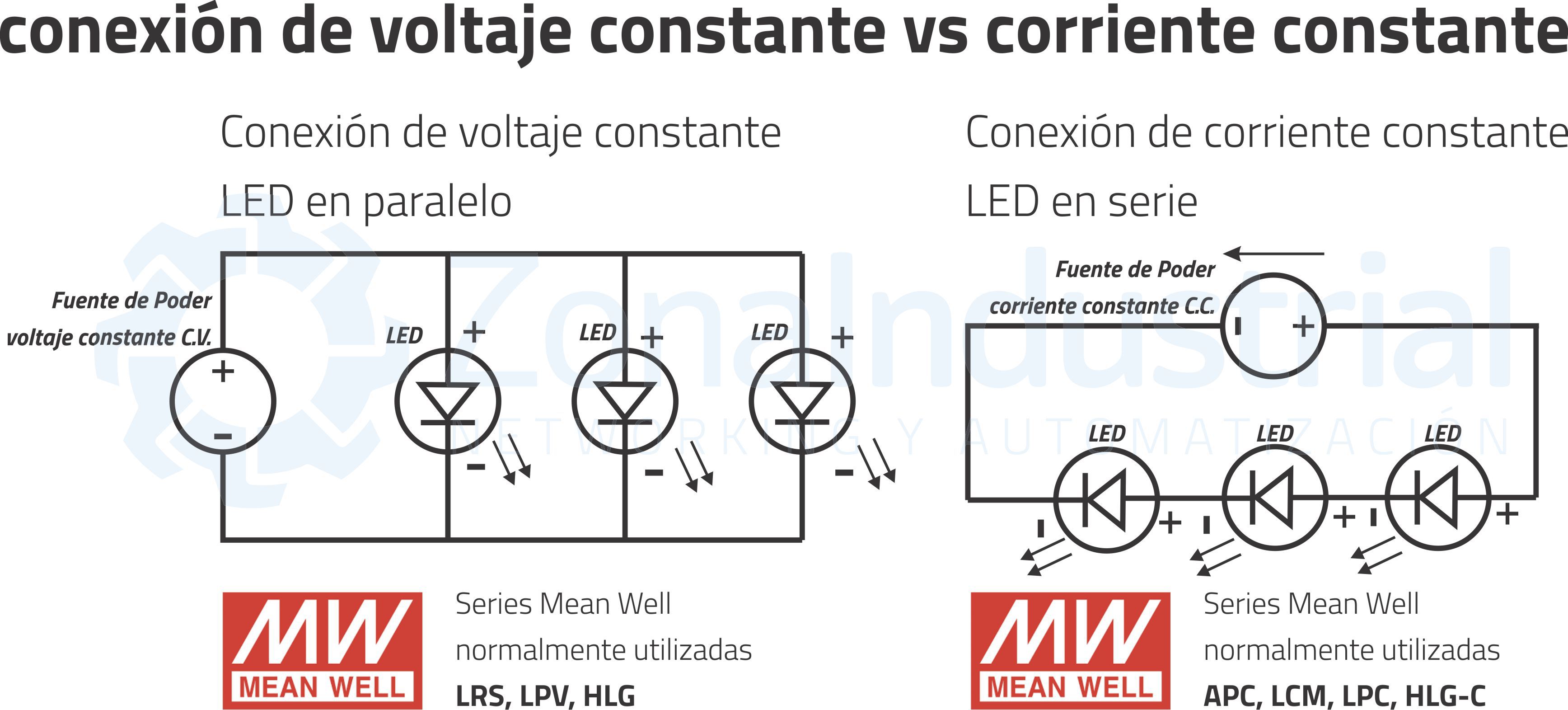 La mayoría de los productos LED que se encuentran en el mercado LED son de tipo voltaje constante. Las luces LED de voltaje constante requieren 12VDC o 24VDC de manera constante, y se atenúan variando la corriente (PWM), mientras que los controladores LED de corriente constante varían el voltaje para mantener una corriente constante en todo el circuito, generalmente 350ma - 750ma. Las luces LED de voltaje constante deben conectarse en paralelo, ya que los circuitos de corriente constante requieren cableado en serie.