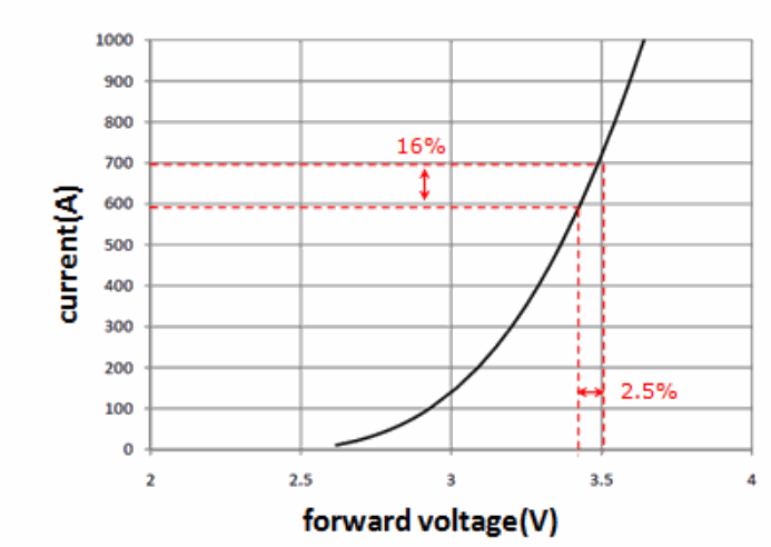 Hasta ahora, ha sido necesario controlar los LED con una corriente constante. Cuando el voltaje directo de un controlador LED aumenta en un 2.5%, la corriente de salida correspondiente aumenta en un 16%.