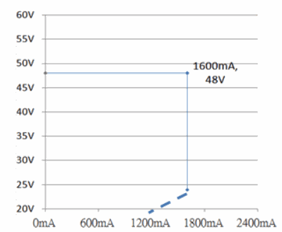 La potencia máxima de salida de ELG-75-48 se alcanza a 48V / 1.56A como se muestra en la siguiente tabla.