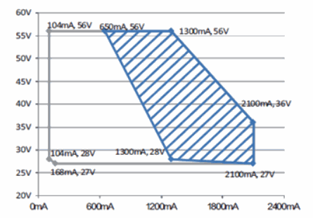 El driver de potencia constante XLG-75-H evita fácilmente este problema. Con el diseño de potencia constante, la XLG-75-H proporciona potencia total dentro de un rango de voltaje entre 36V y 58V. Los clientes pueden ajustar la corriente de salida dentro del área sombreada en la siguiente tabla, lo que les permite usar este controlador LED para alimentar luminarias con diferentes requisitos de energía.