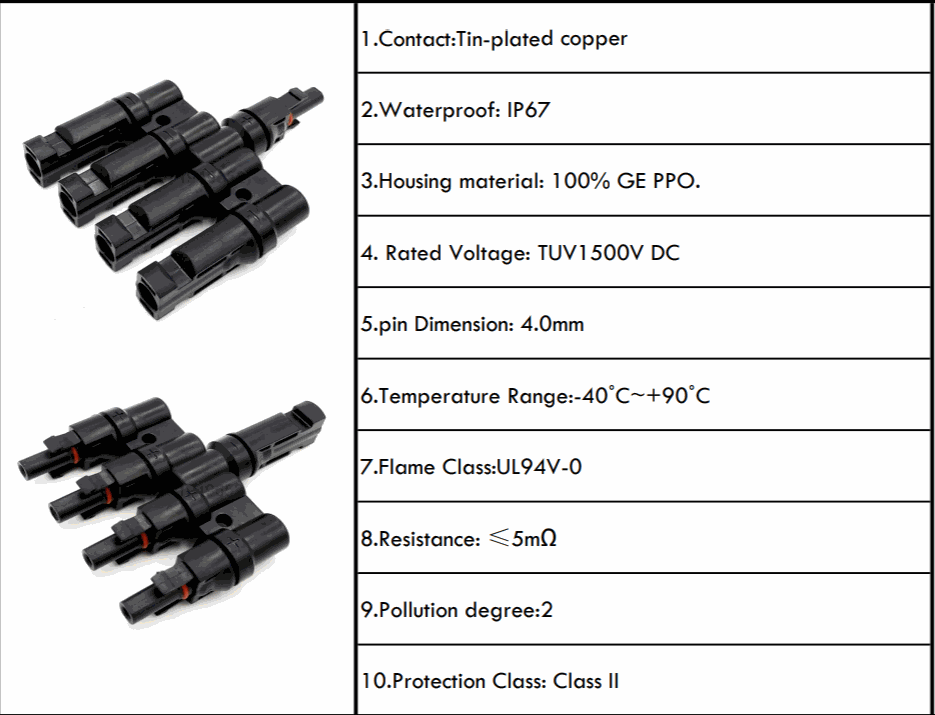 Conector MC4 cuádruple para conectar 4 paneles solares en paralelo.